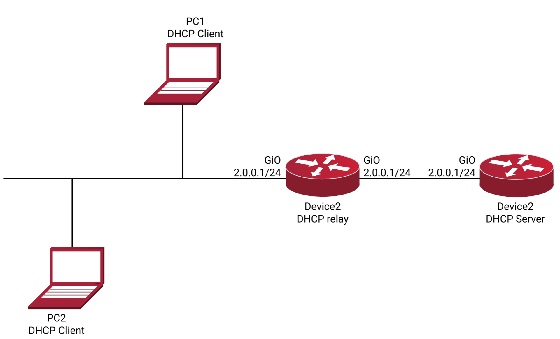 Device2(config)#interface gigabitethernet 0 Device2(config-if-gigabitethernet0)#ip dhcp relay Device2(config-if-gigabitethernet0)#ip dhcp relay server-address 2.0.0.1