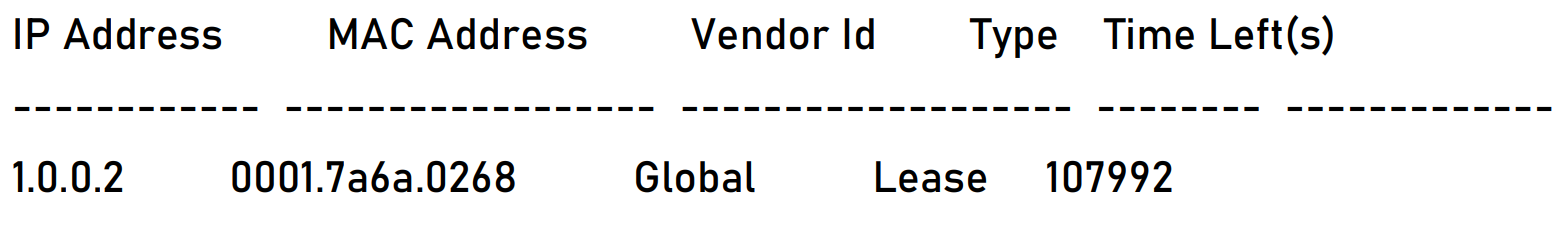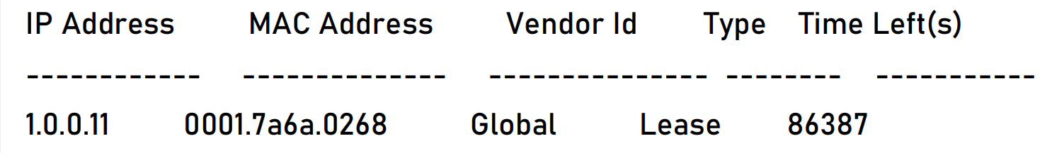 Используйте команду show ip dhcp pool dynamic-pool lease, чтобы запросить IP-адреса, выделенные клиентам. Результат показывает, что клиент получил IP-адрес 1.0.0.11.