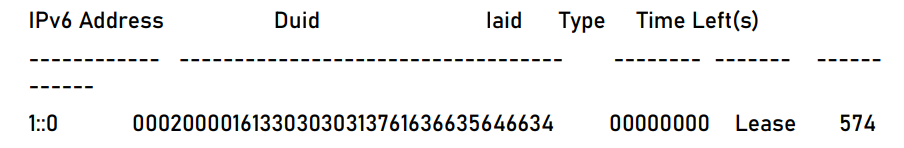 Используйте команду show ipv6 dhcp pool dynamic-pool lease для запроса адресов IPv6, выделенных клиентам. Результат показывает, что клиент получил IPv6-адрес 1::0.