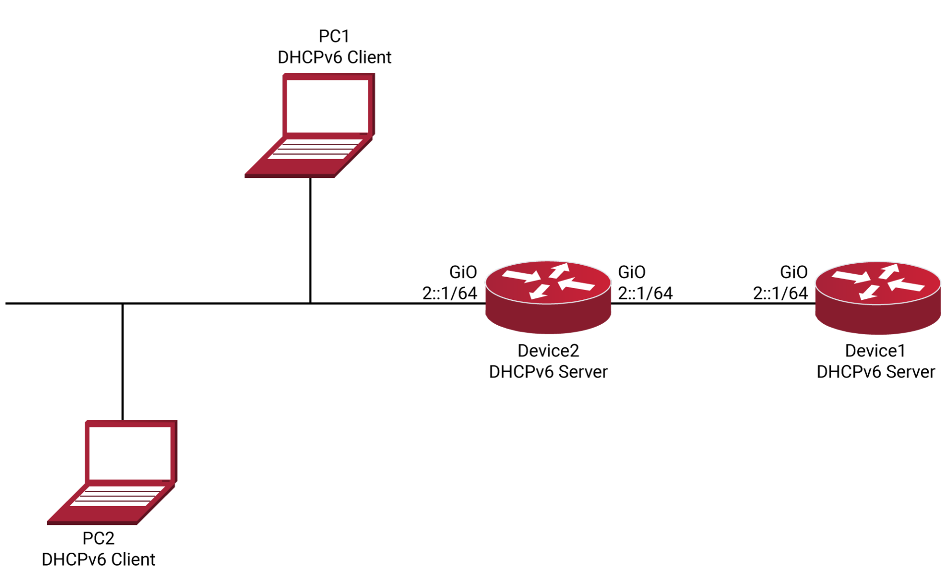 Device1— это сервер DHCPv6, а интерфейс Device2 включает функцию ретрансляции DHCPv6.
