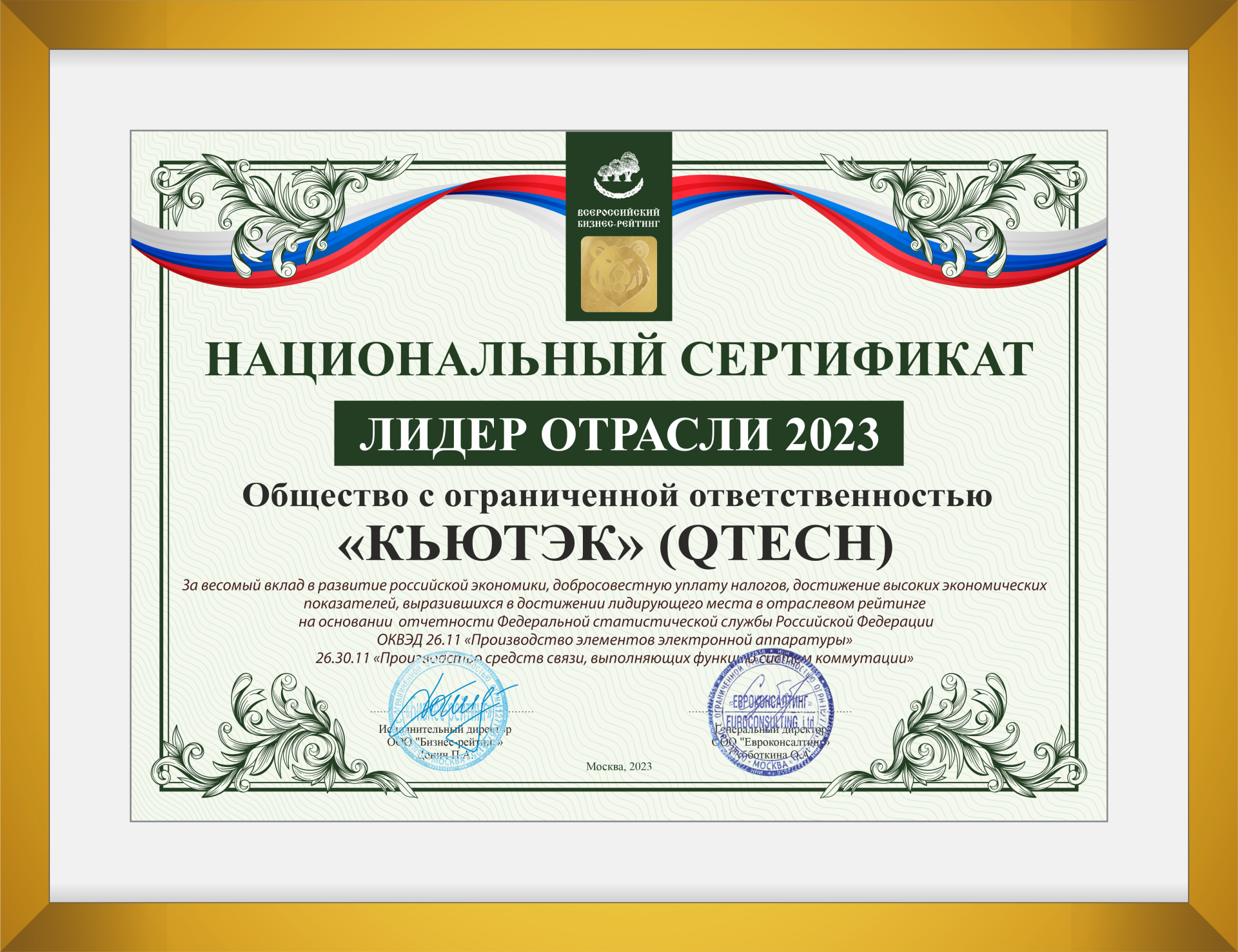 На основании анализа своей деятельности компания QTECH получила национальный сертификат "Лидер отрасли 2023" по двум видам деятельности: ОКВЭД 26.11 "Производство элементов электронной аппаратуры" и 26.30.11 "Производство средств связи, выполняющих функцию систем коммутации".