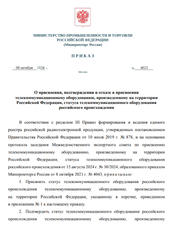 Минпромторг РФ подтвердил статус телекоммуникационного оборудования российского происхождения коммутаторов QTECH в приказе № 4623 от 08.10.2024 года. Процедура подтверждения статуса ТОРП производится ежегодно и является обязательным условием для использования коммутаторов в проектах государственных заказчиков.