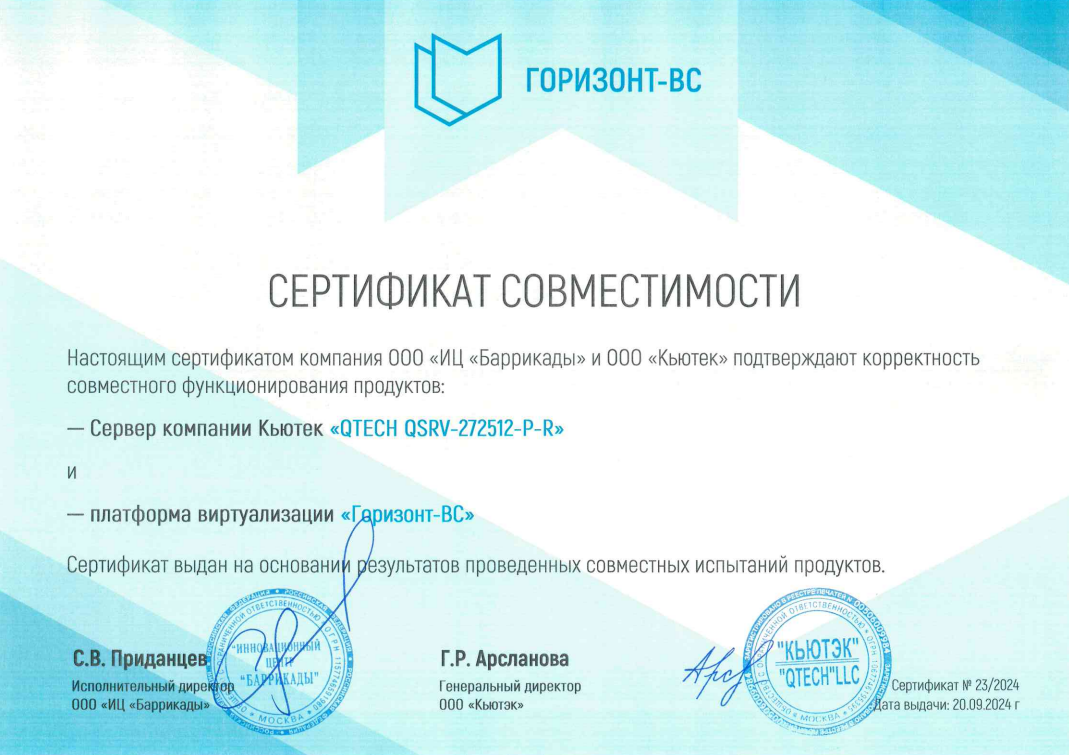 Компания QTECH и ИЦ «Баррикады» – известный российский разработчик программного обеспечения провели тестирование совместимости реестровых серверов 3-го поколения серии QSRV и платформы виртуализации «Горизонт-ВС». Лабораторные испытания завершились успешно и подтвердили полную совместимость серверного оборудования с платформой виртуализации. Корректность совместного функционирования подтверждена сертификатом, выданным на основании результатов испытаний.