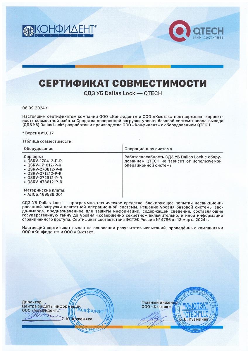 Компании QTECH и «Конфидент» провели успешное тестирование совместной работы серверов серии QSRV со средствами доверенной загрузки уровня платы расширения (СДЗ ПР) и базовой системы ввода-вывода (СДЗ УБ) Dallas Lock. Испытания продемонстрировали, что серверное оборудование полностью совместимо со средствами доверенной загрузки обоих уровней и корректно работает во всех режимах, вне зависимости от используемой операционной системы.