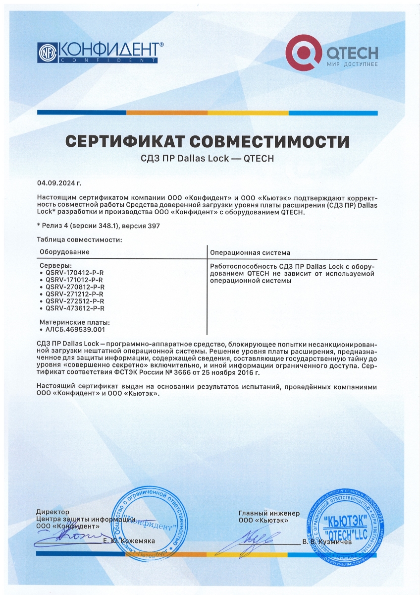 Совместное использование серверов QTECH со статусом ТОРП, внесенных в реестр Минпромторга РФ, и средств доверенной загрузки Dallas Lock, имеющих сертификаты соответствия ФСТЭК России, позволяет значительно повысить безопасность информационной инфраструктуры.