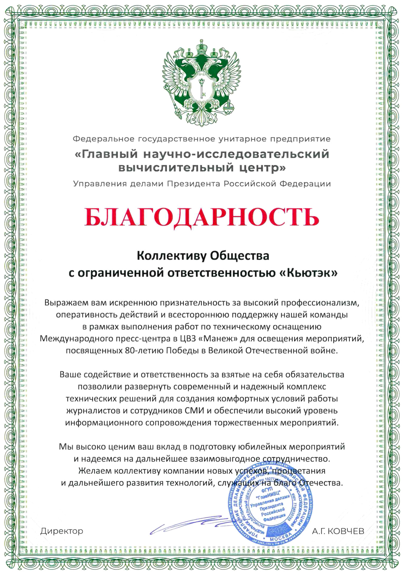 В рамках подготовки и проведения праздничных мероприятий, посвящённых 80-й годовщине Победы в Великой Отечественной войне, компания QTECH поставила комплект телекоммуникационного оборудования для развертывания высоконадежной сетевой инфраструктуры в Центральном выставочном зале «Манеж» в Москве.