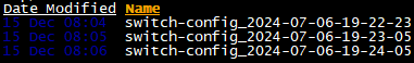 QSW-4530#config QSW-4530 (config)#backup server tftp://192.168.0.1 QSW-4530 (config)#backup time 1 QSW-4530 (config)#backup path backup/switch-config QSW-4530 (config)#backup write QSW-4530 (config)#backup autoВ данном примере конфигурация будет сохраняться на сервере каждую минуту автоматически с названием начинающимся на switch-config. Пример сохраненных файлов: