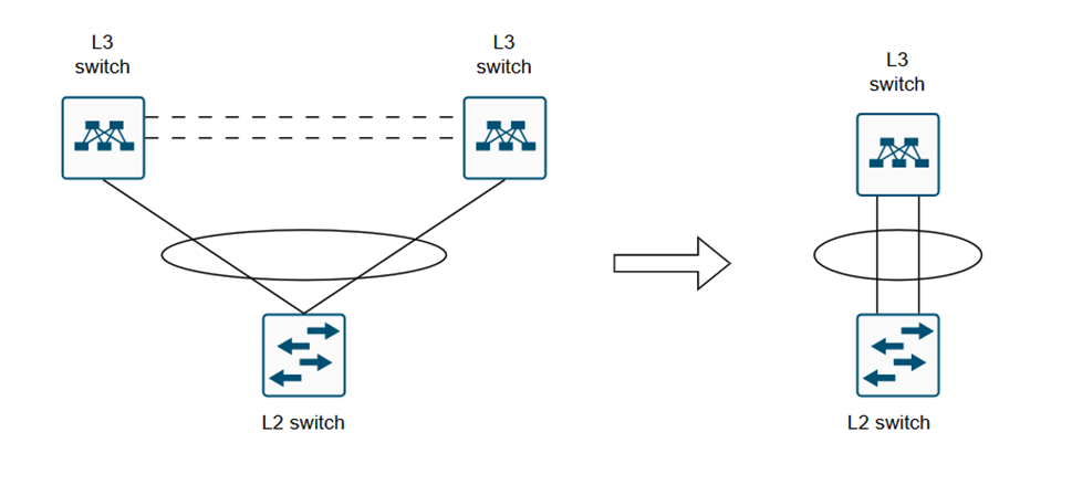 Оба устройства сохраняют независимость. MCLAG упрощает развертывание и устраняет недостатки стекирования (например, сбой программного обеспечения на ведущем устройстве может вывести из строя весь стек).