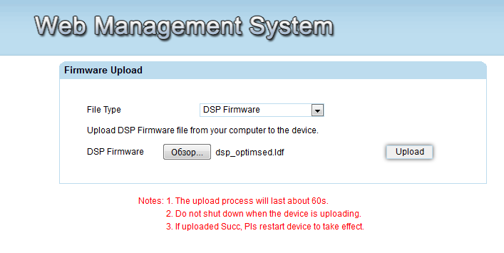 Для этого необходимо зайти во вкладку: «Maintenance->Firmware Upload», далее в поле «file type» выбрать «DSP Firmware» и загрузить патч с компьютера (рис. 1)